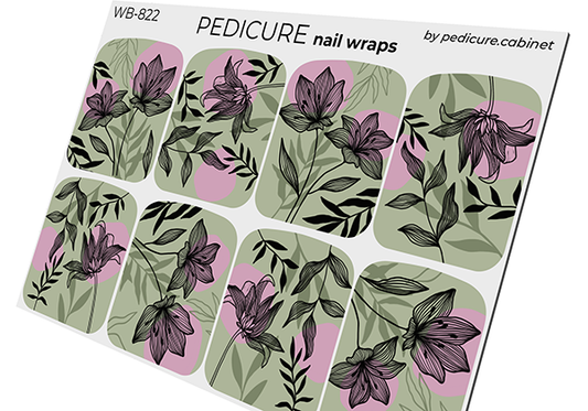 Pedicure Black flowers. Pink lilac. Foil silver. Large. Nail wrap WB-824