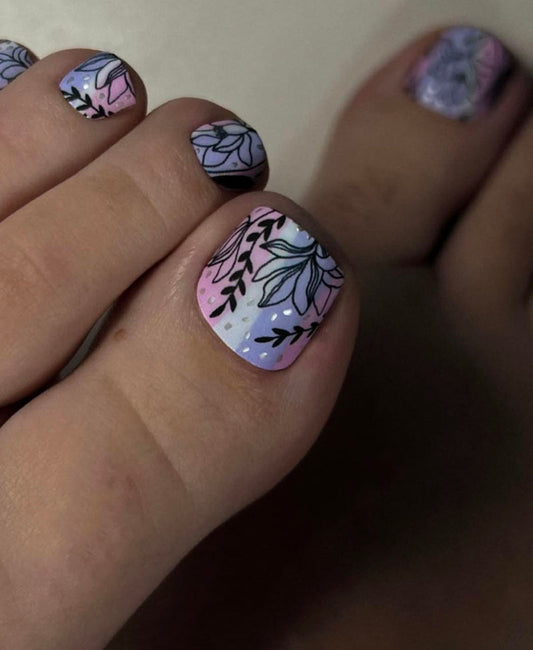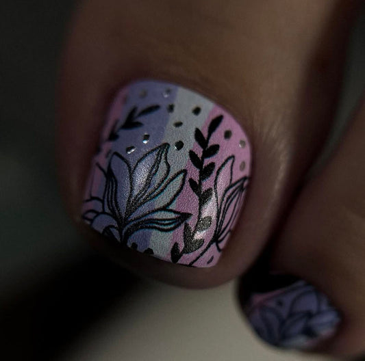 Pedicure Black flowers. Pink lilac. Foil silver. Nail wrap WR-854