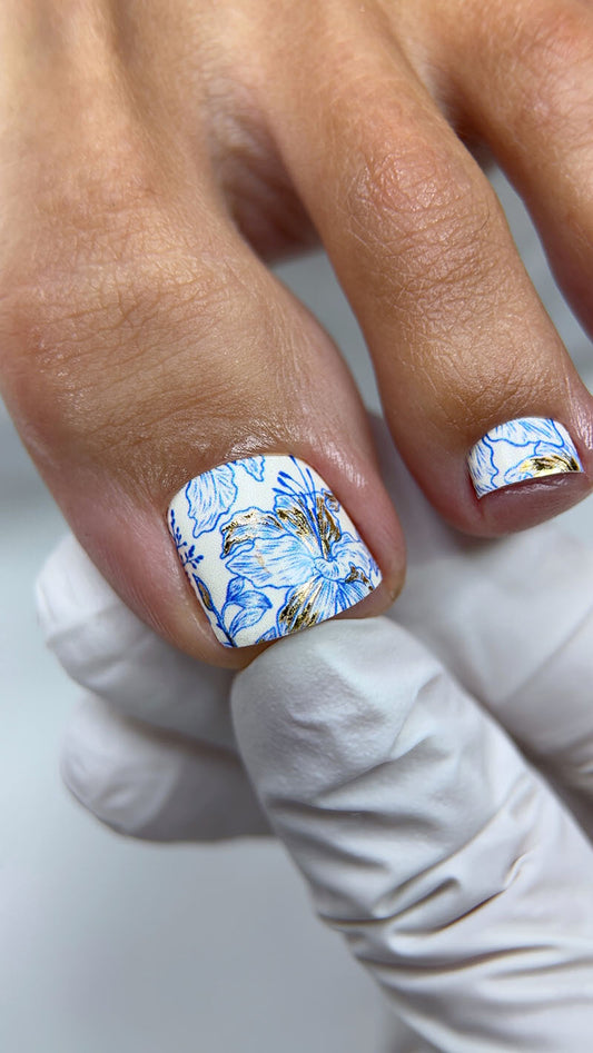 Pedicure Blue Flowers. Gold Foil. Nail wraps WR-567