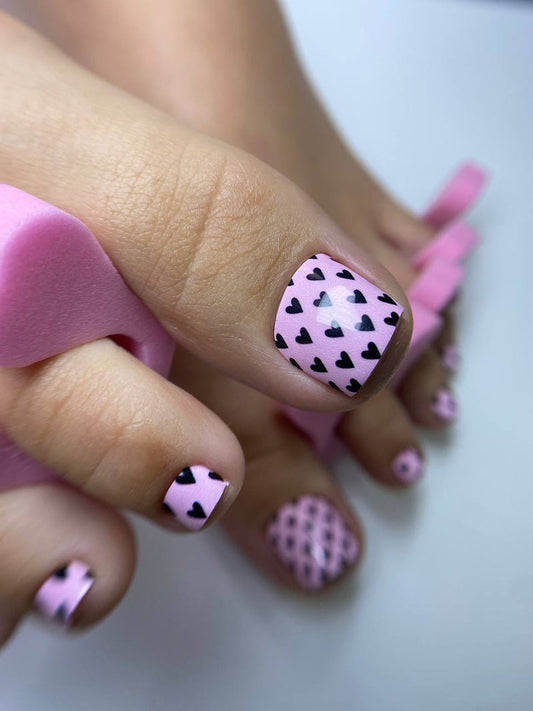 Pedicure Black Hearts. Pink Background. Nail wrap WR-727