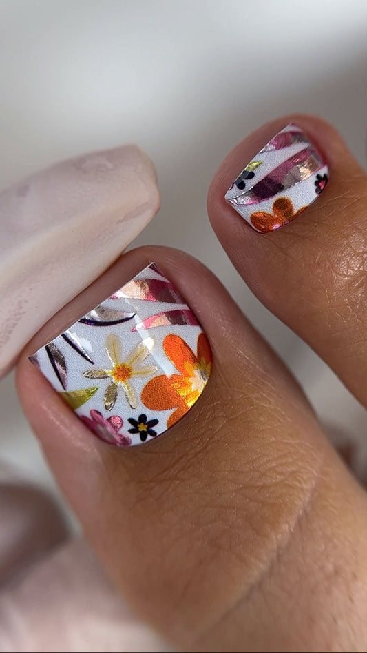 Pedicure Flowers and Stripes. Silver Foil. Nail wraps WR-561