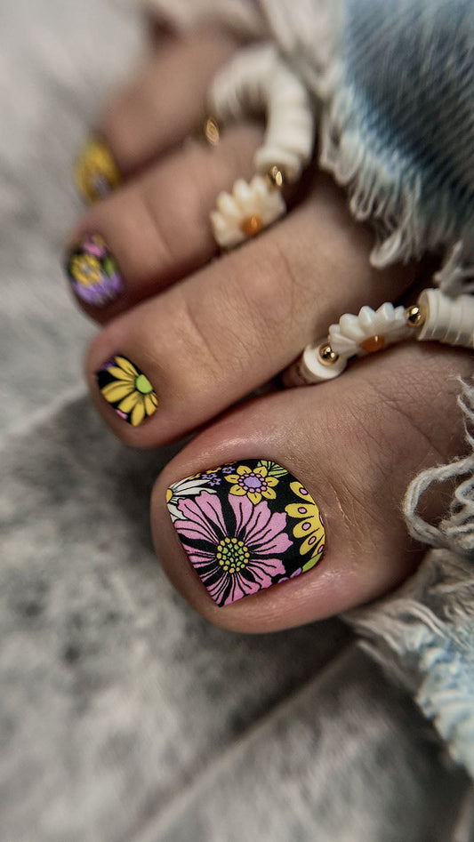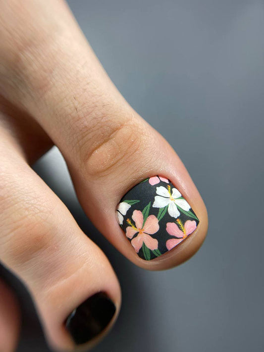 Pedicure Flowers. Black Background. Large. Nail wrap WB-724