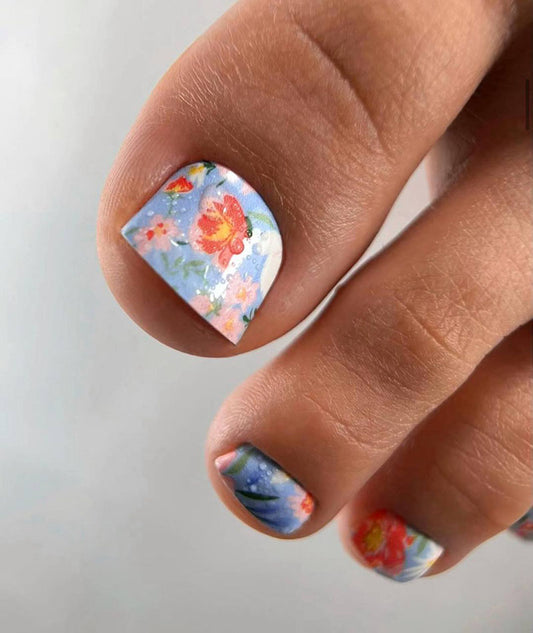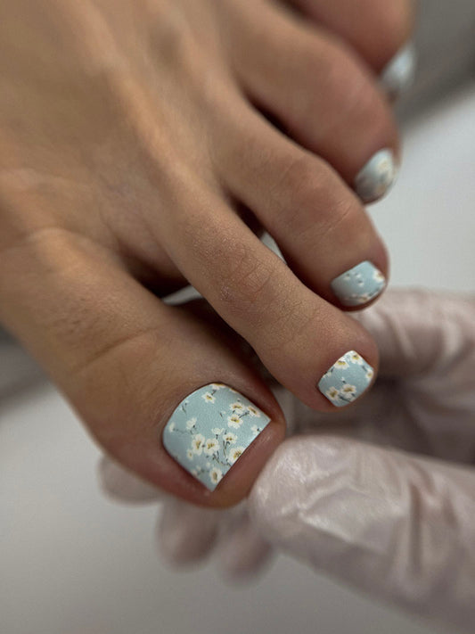 Pedicure Small Flowers. Blue Background. Nail wrap WR-717