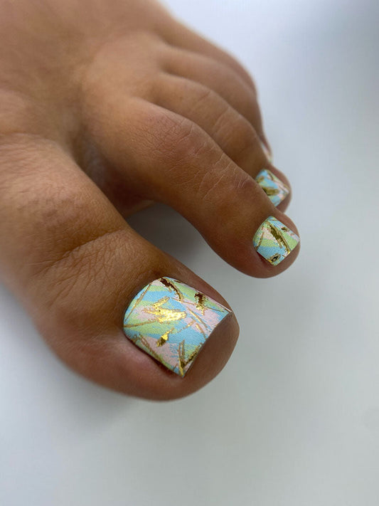 Pedicure Strokes: Pink, Blue, Green. Gold Foil. Nail wrap WR-704