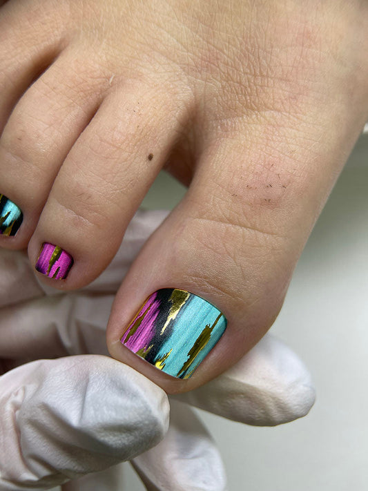 Pedicure Strokes: Pink, Blue, Green, and Black. Gold Foil. Large. Nail wrap WB-703