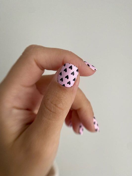 Manicure Black Hearts. Pink Background. Nail wrap WM-723