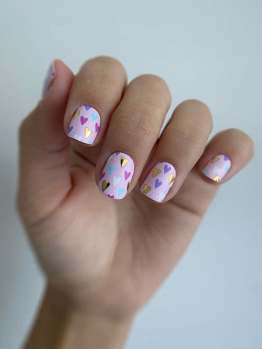 Manicure Hearts. Pink Background. Gold Foil. Nail wrap WM-733