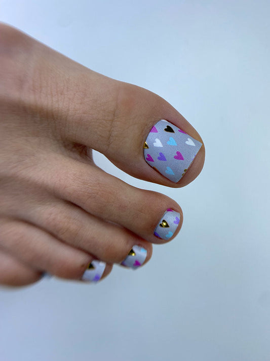 SPECIAL PRICE FOR YOUR COUNTRYPedicure Hearts gray background. Foil gold. Nail wrap WR-767