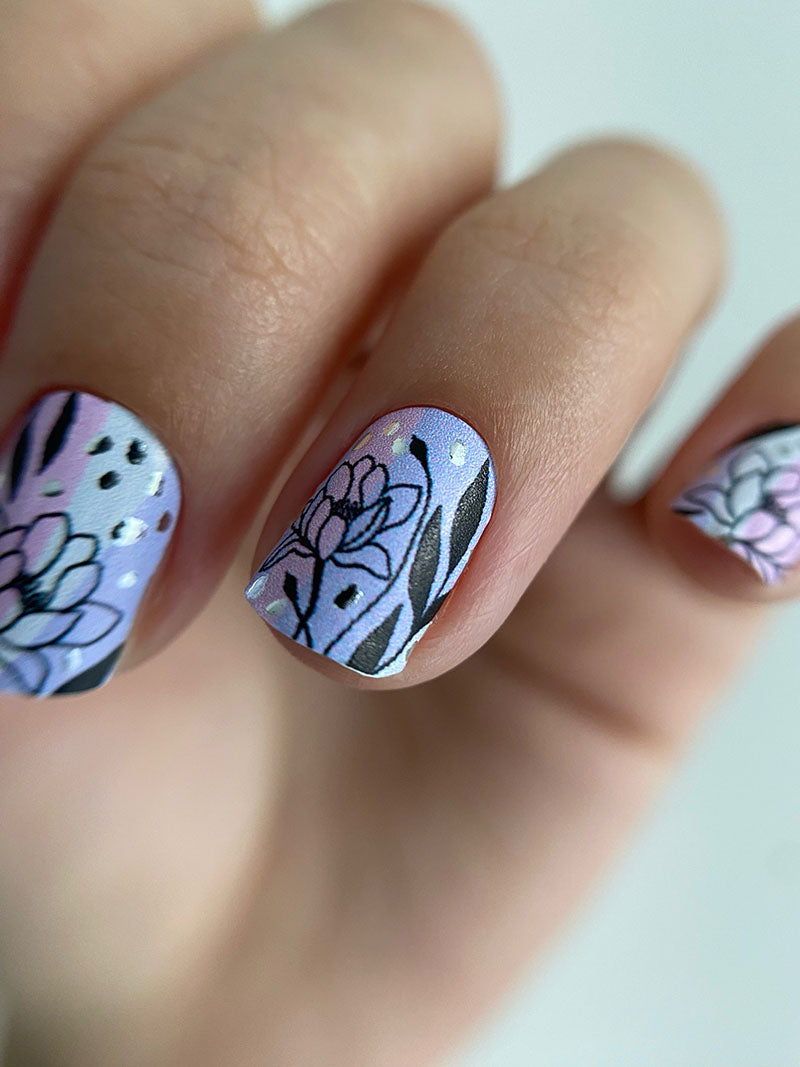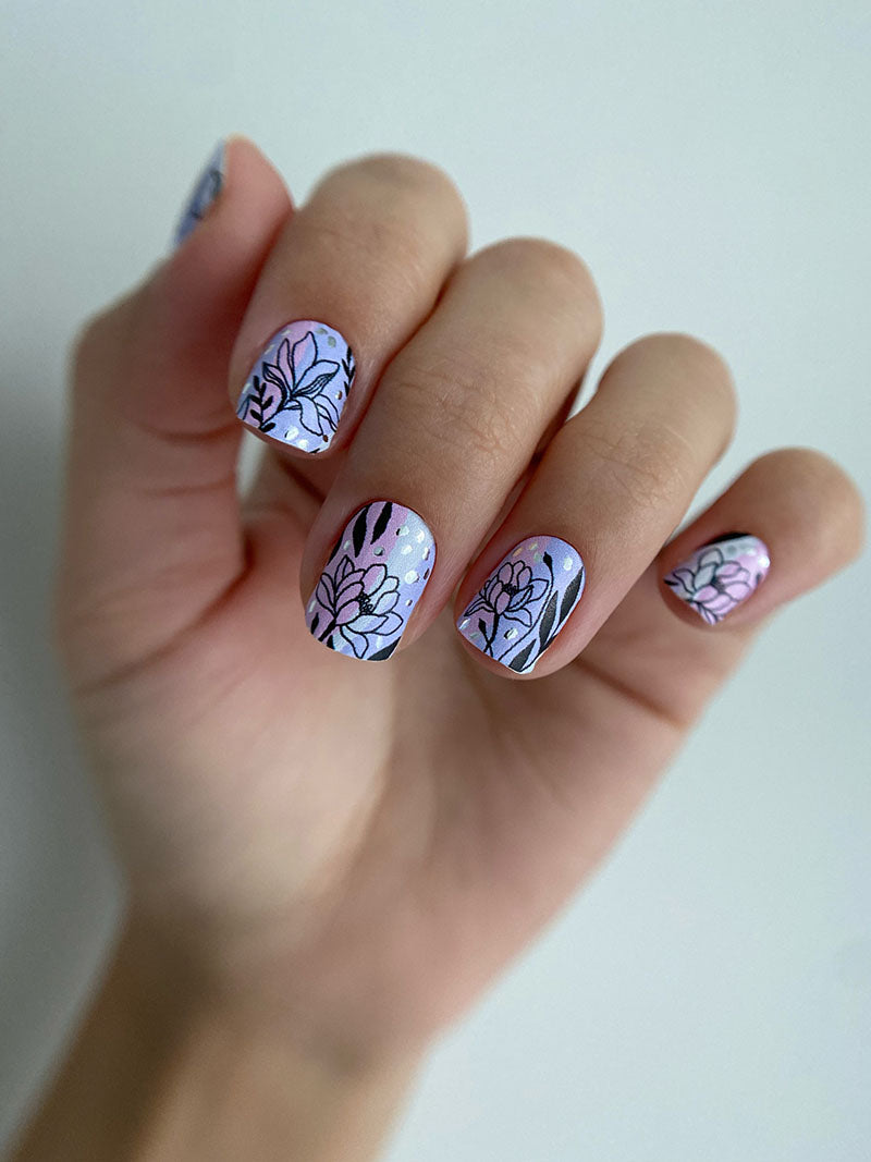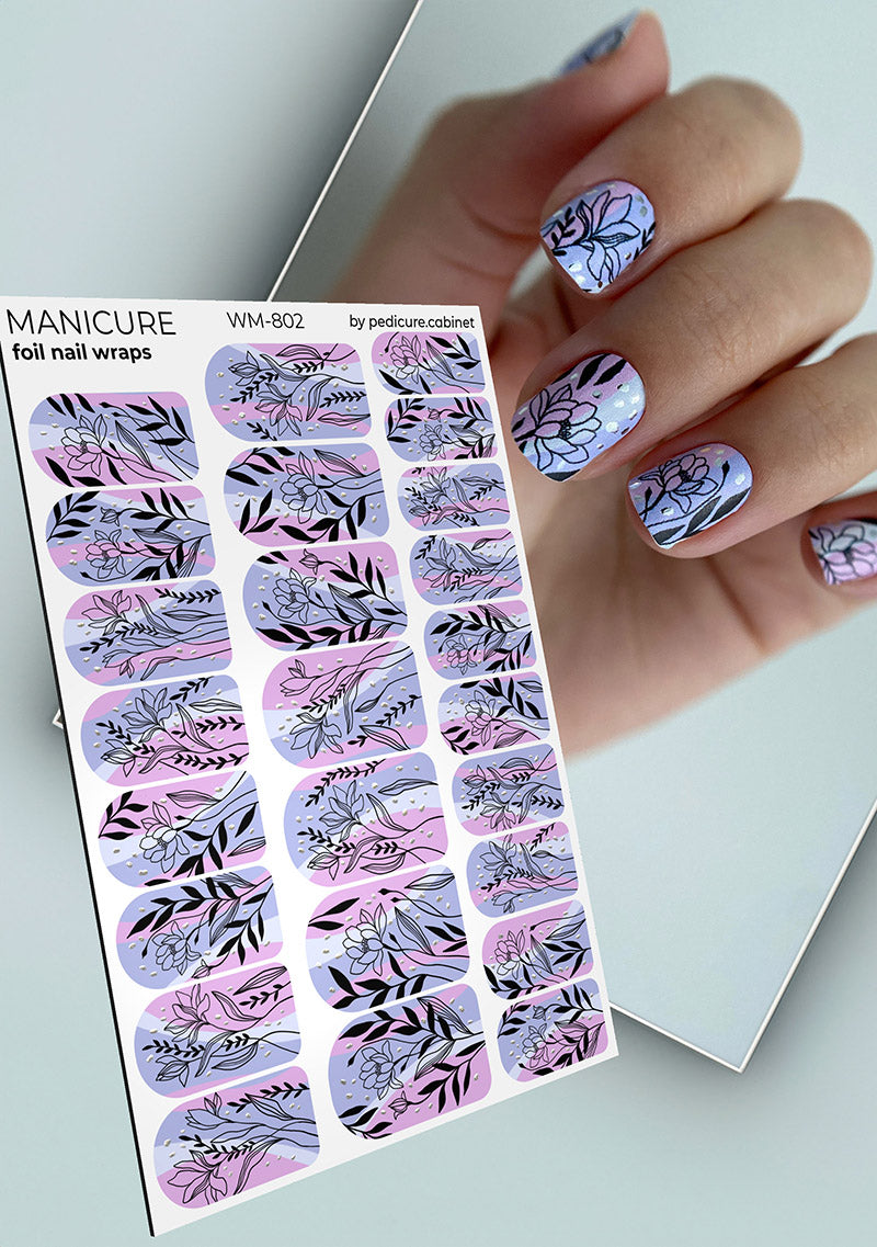 Manicure Black flowers. Pink lilac. Foil silver. Nail wrap WM-802