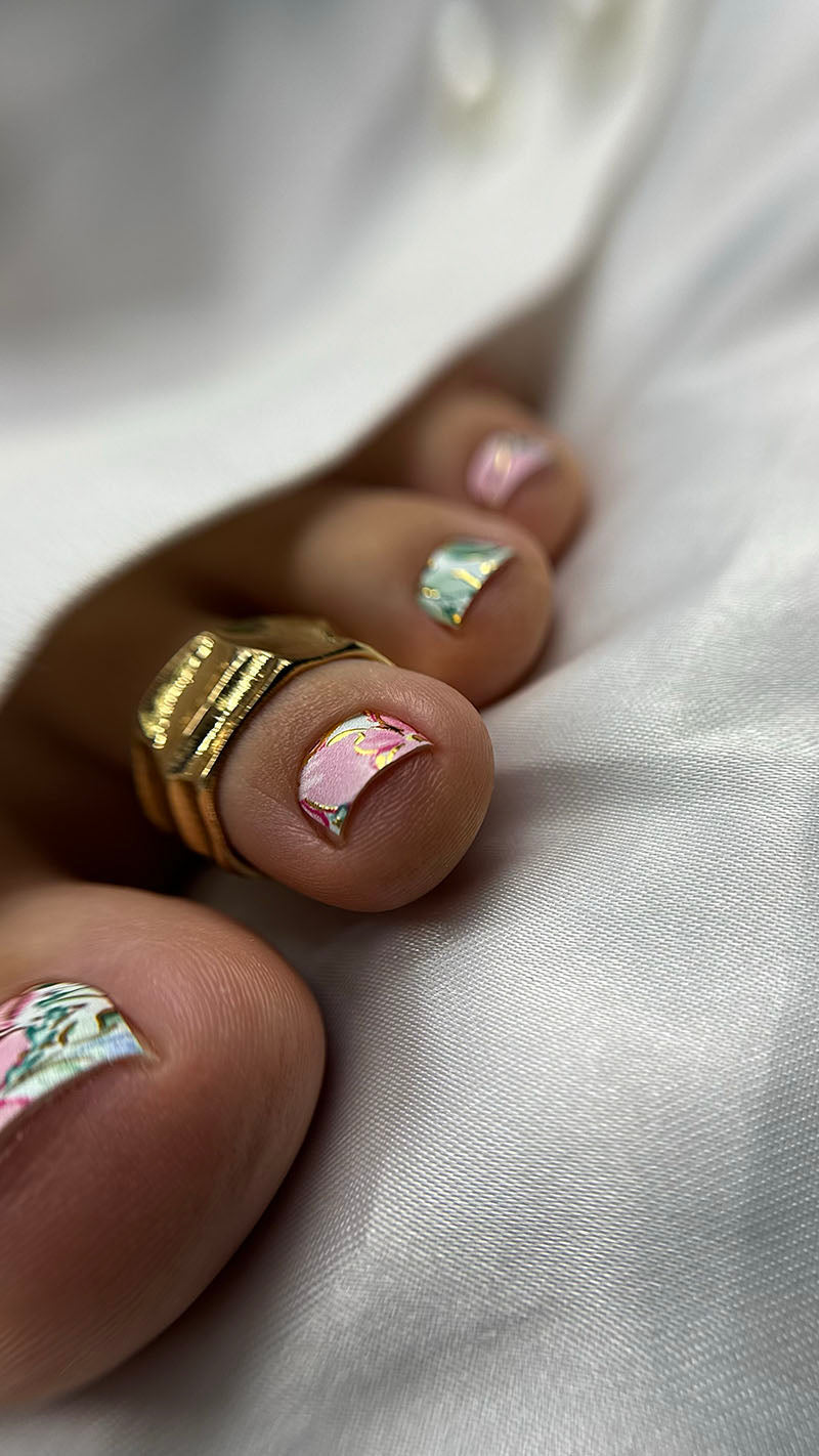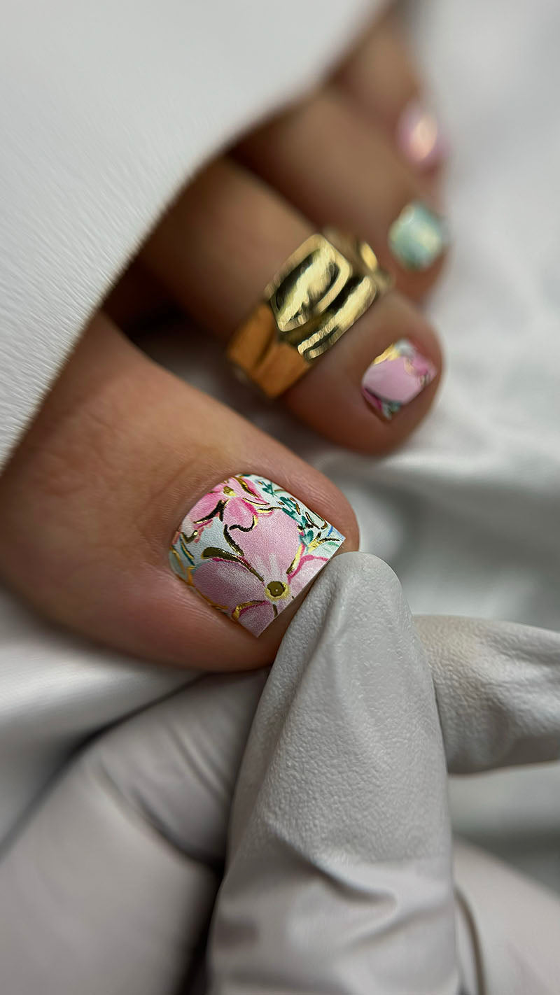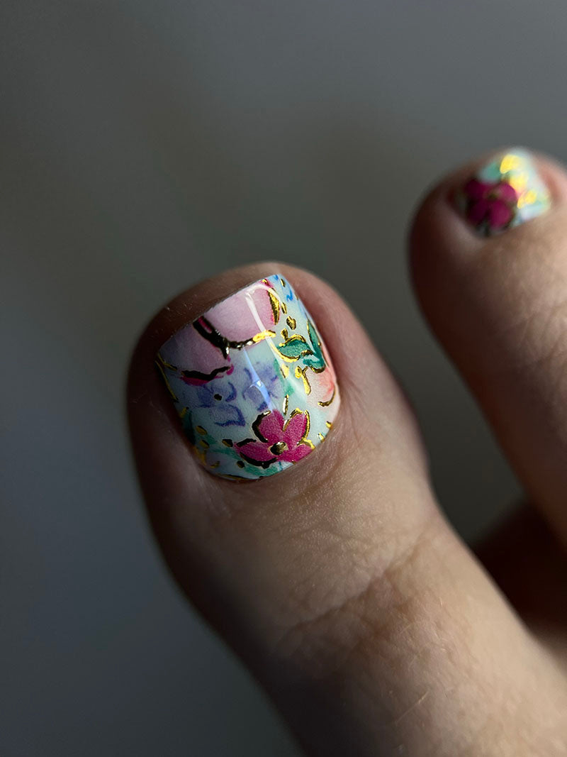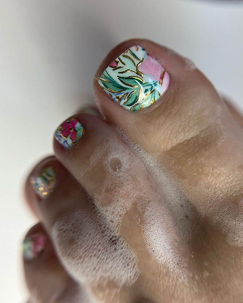 Pedicure Flowers. Watercolor. Foil gold. Nail wrap WR-850